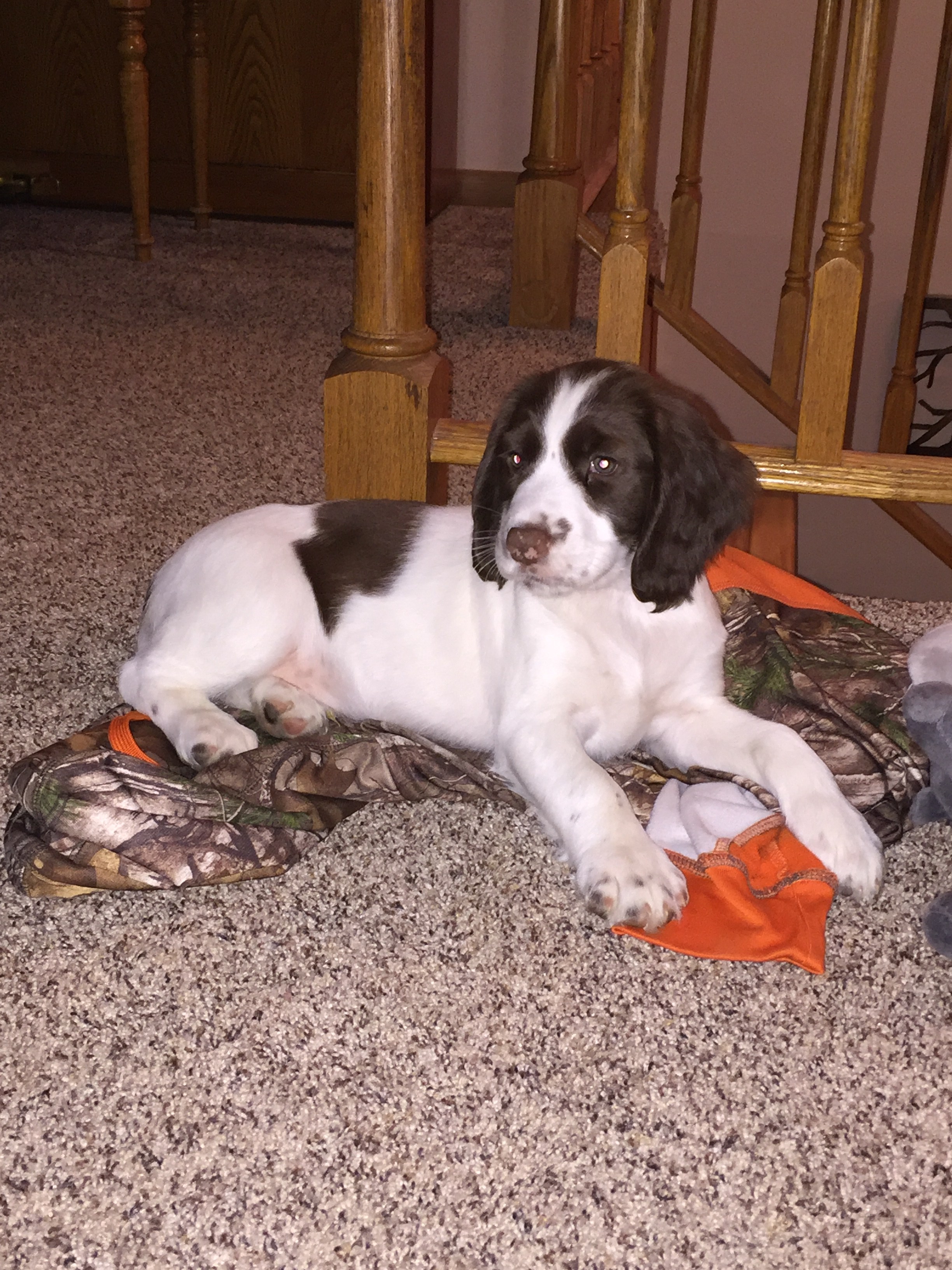 My Little Lady was born 5/13/2011. Lady was from my original bloodline going back to Chatty’s Hershey Kiss (Hershey) whom I bought as a puppy in 1995 from Roger Dolliff through the late Dan Langhans. Mr Langhans is now in the English Springer Spaniel Hall of Fame. Hershey had several years of field trial experience when she was handled by Dan Langhans to a 3rd place in 2001, and performed well at the nationals that fall. She was one of only 20 dogs to successfully complete all 7 series of the Open National Championship out of the 150 dogs entered that year.